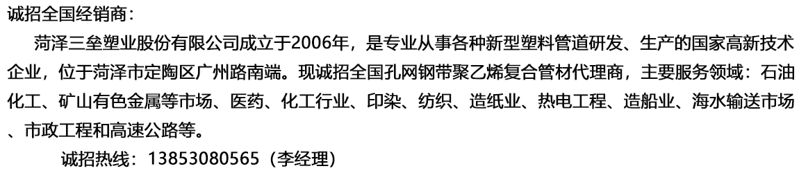 菏澤三壘塑業(yè)股份有限公司專(zhuān)業(yè)從事各種新型塑料管道研發(fā)和生產(chǎn),重點(diǎn)研發(fā)了孔網(wǎng)鋼帶聚乙烯復(fù)合管材